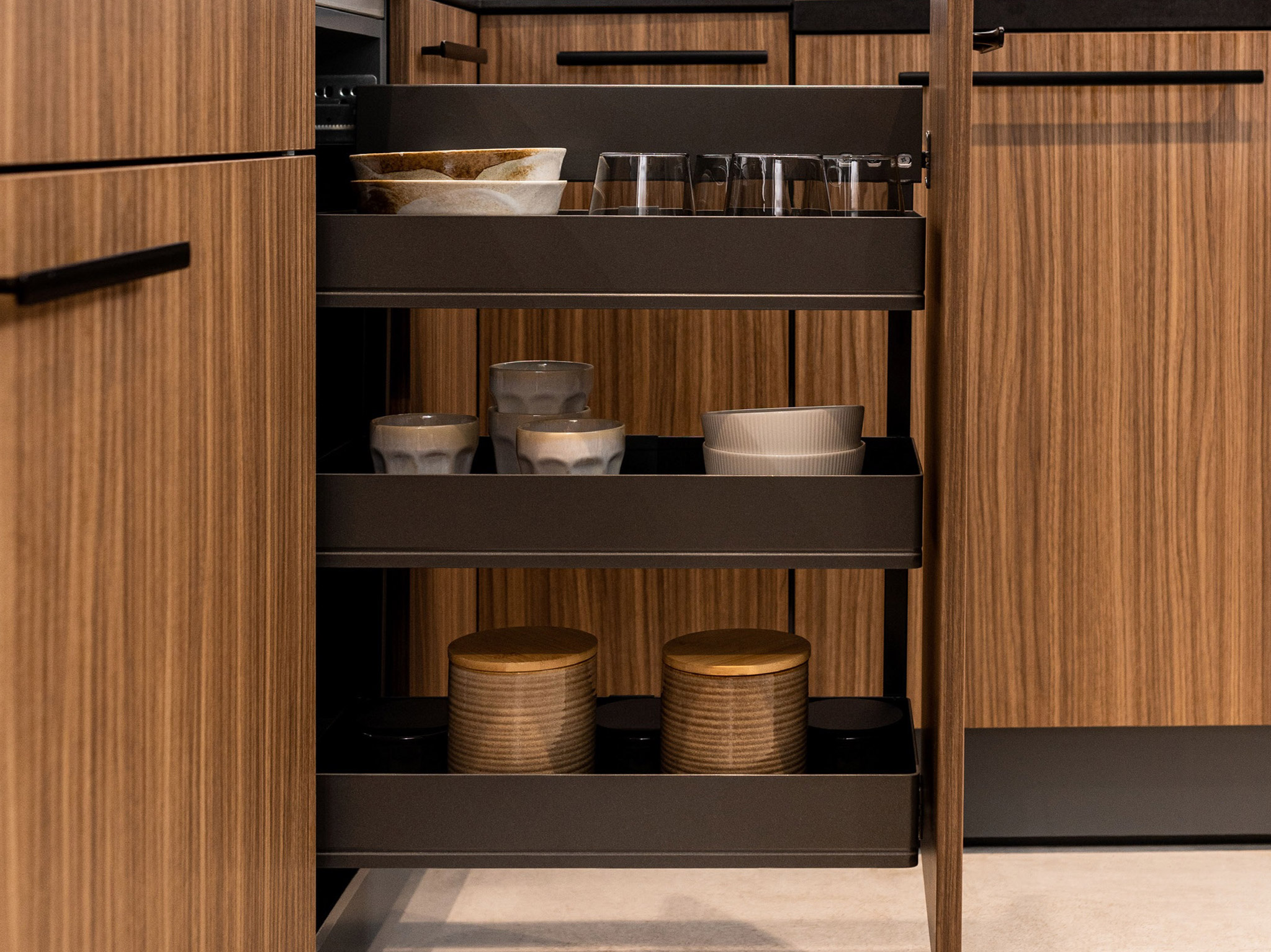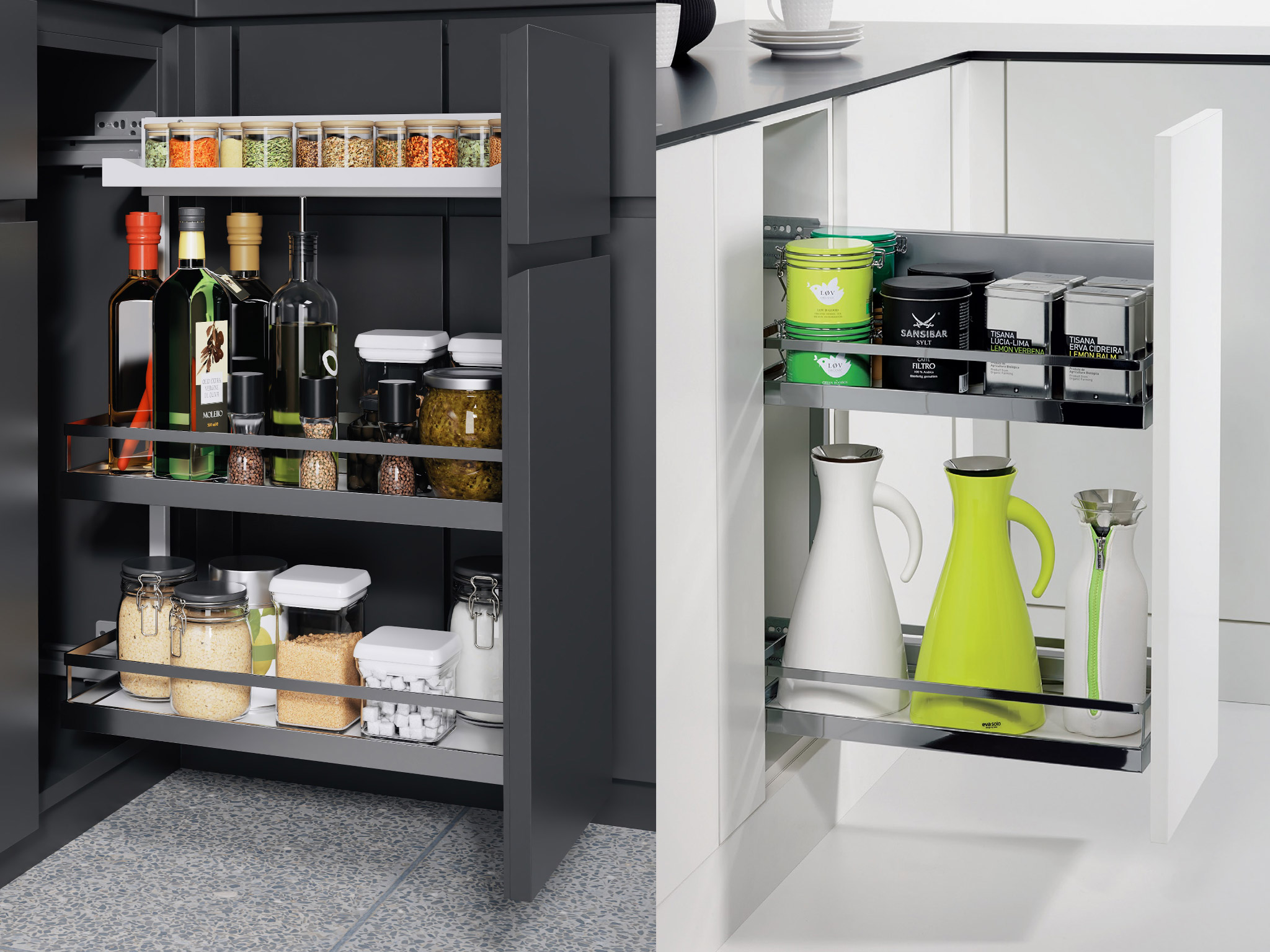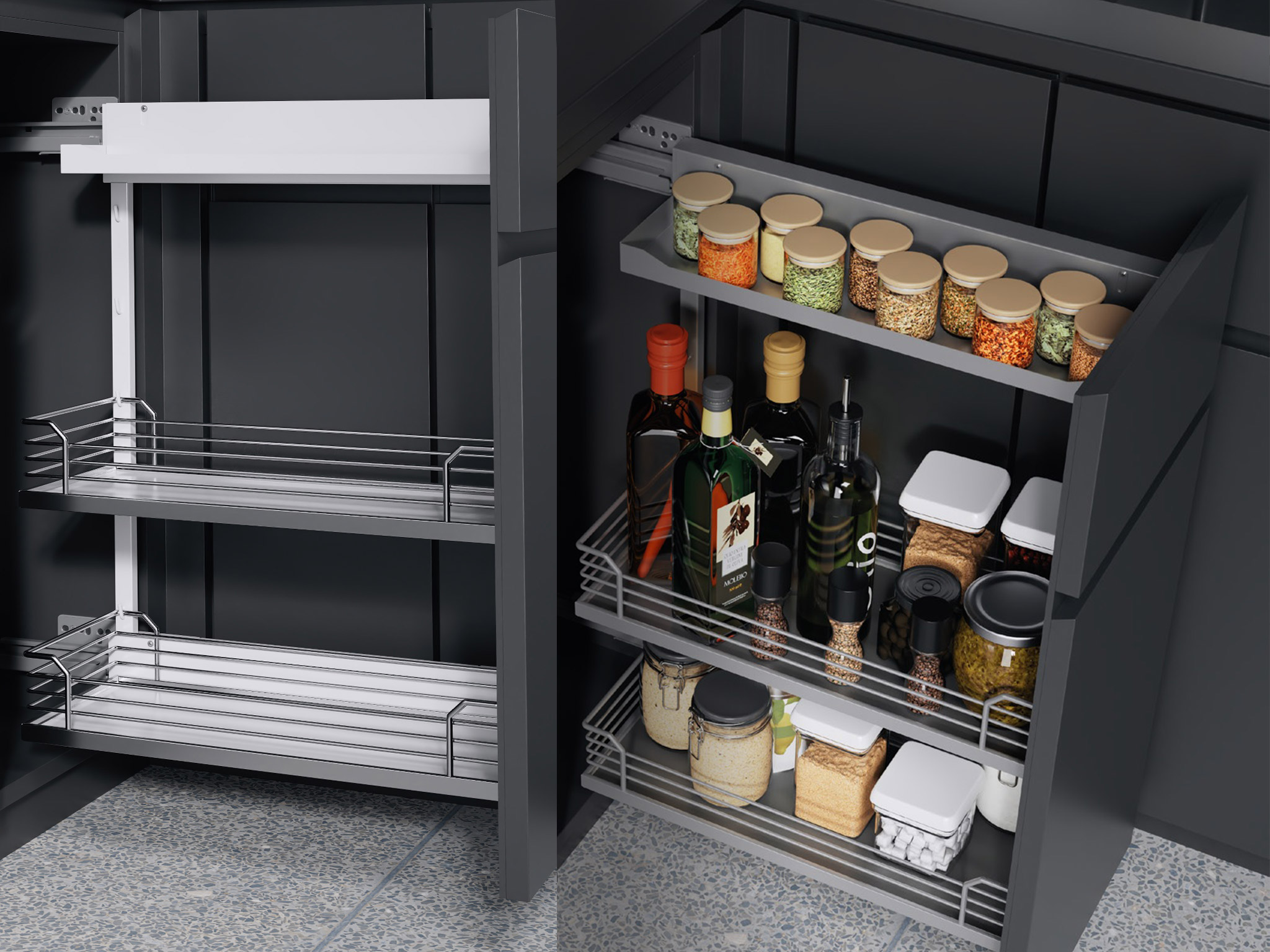 Легко быть удобным с Комфорт II — механизм для максимально удобного доступа к содержимому в нижних тумбах. Все полки имеют закрытое дно и регулируются по высоте, позволяя рационально использовать пространство внутри тумбы. Наверху находится узкая полка для специй, также служащая декоративным элементом: она закрывает собой крепеж.