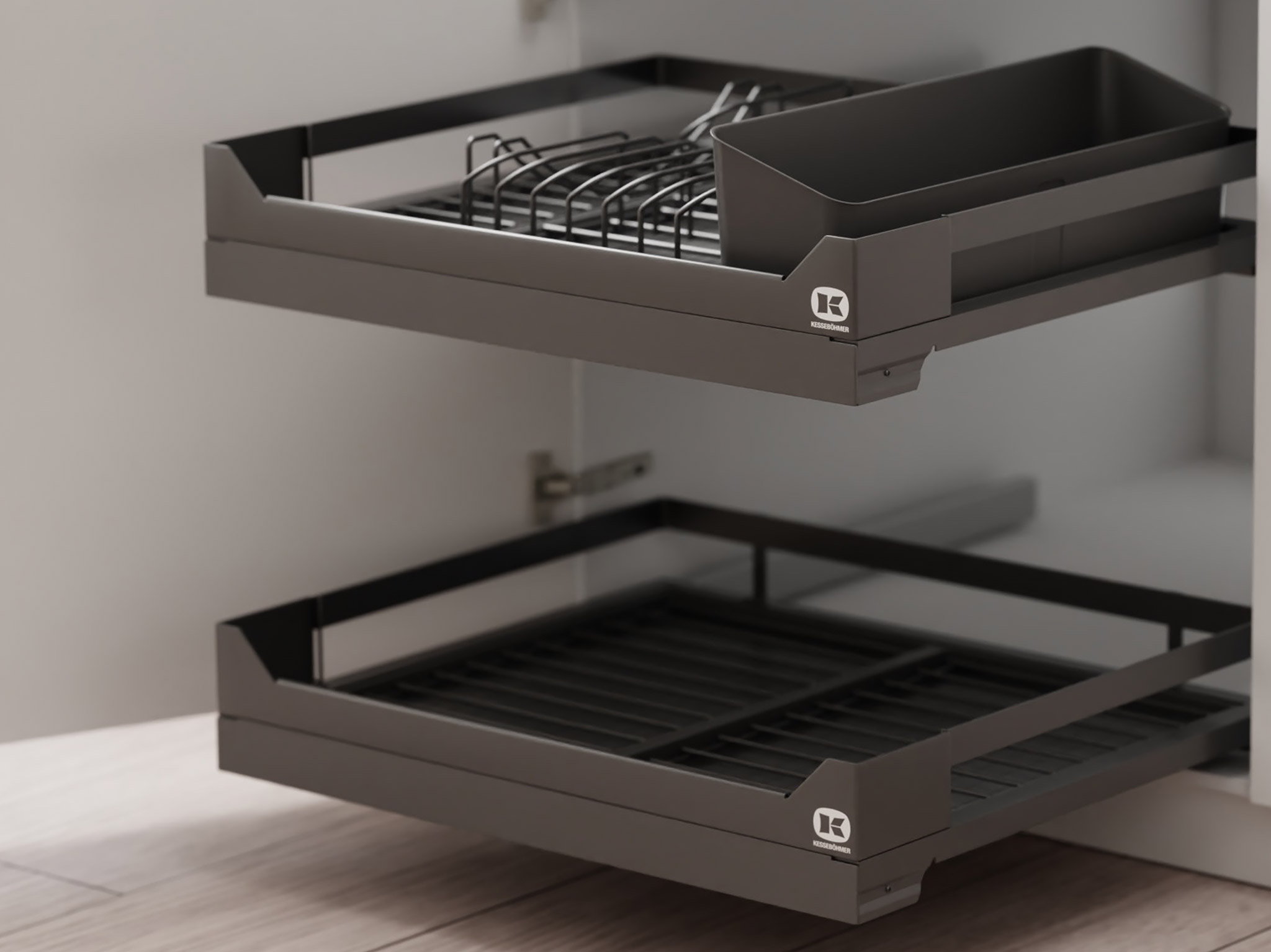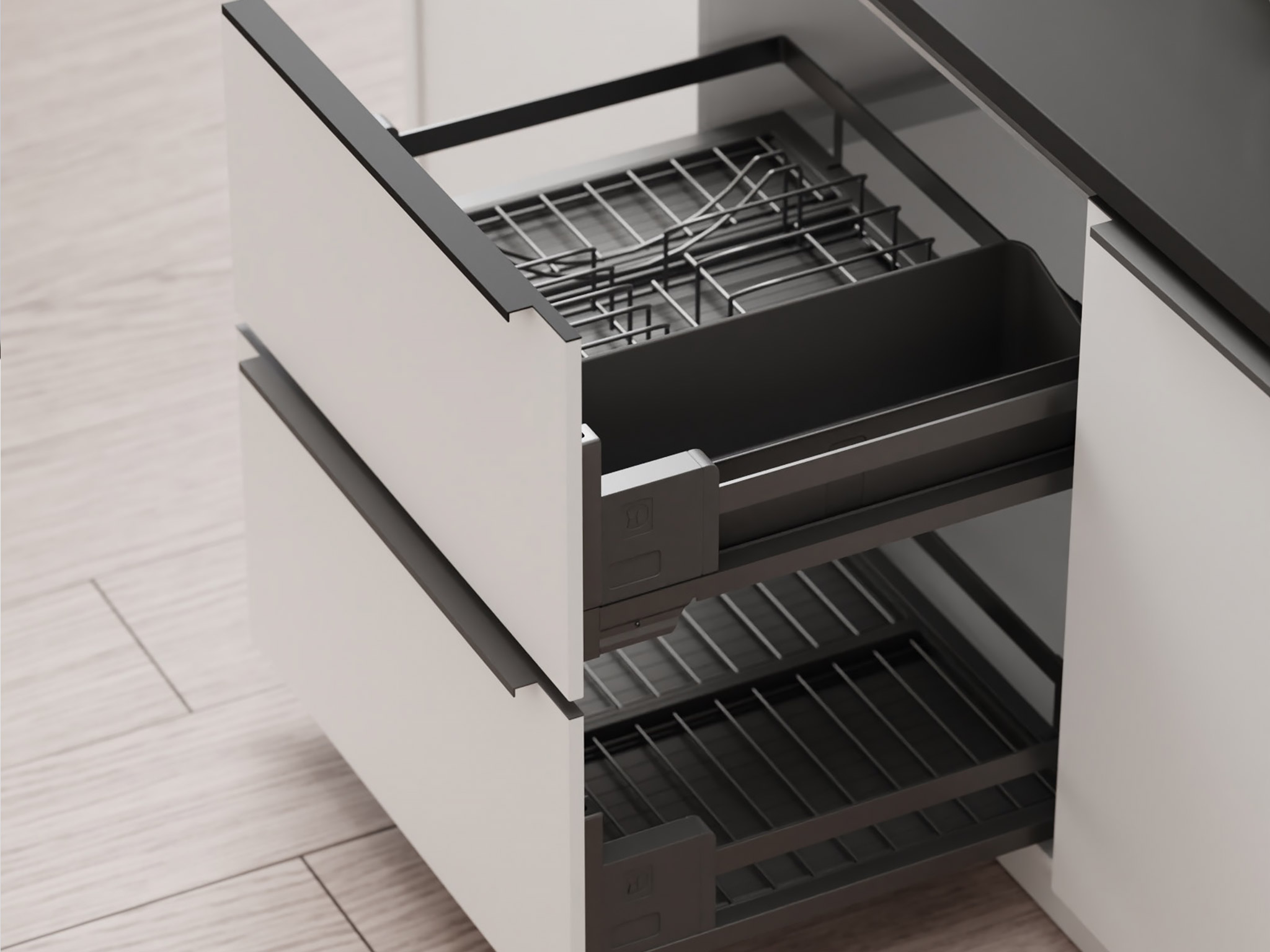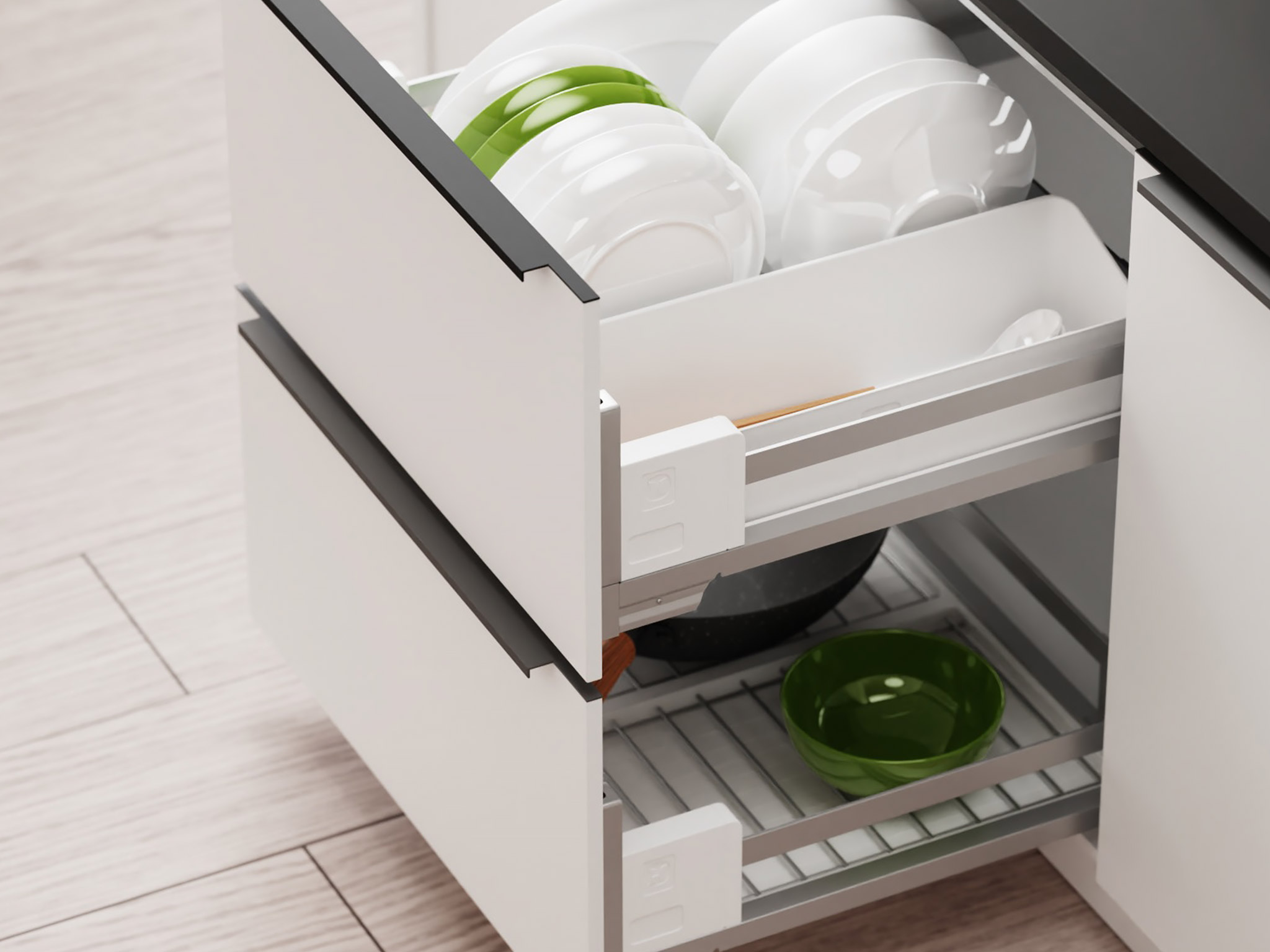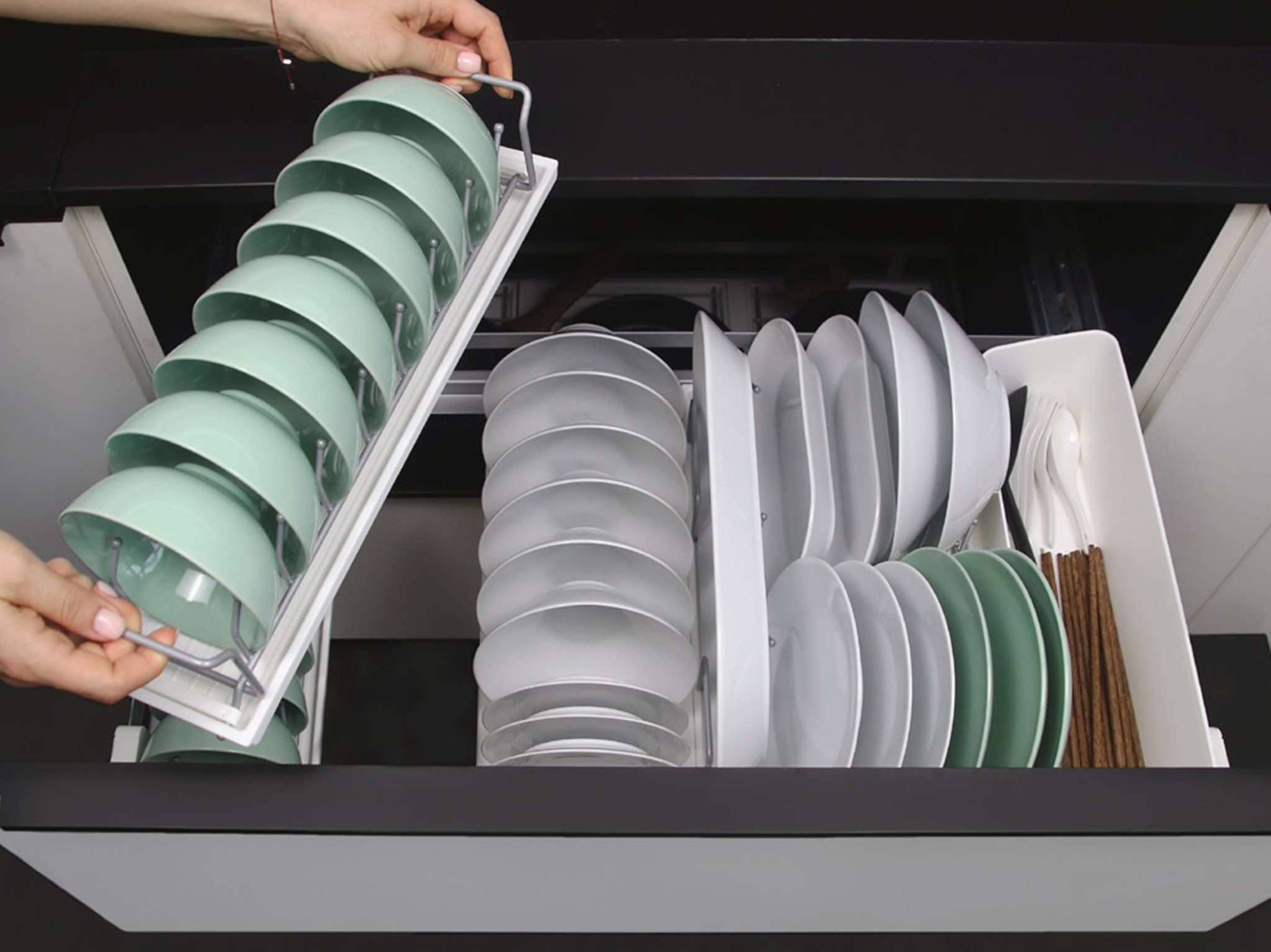 Новая идея хранения с Дайнинг Агент — специально для нижних шкафов мы создали удобный. Органайзер для хранения посуды и сервировки. Внутреннее наполнение легко достать и можно использовать в качестве сервировочных подносов. Максимальная нагрузка – до 12 кг на одну полку, а встроенный доводчик делает работу механизма тихой и бесшумной. Жесткий поддон из экологичного пластика легко снимается. Подходит для мытья в посудомоечной машинке.