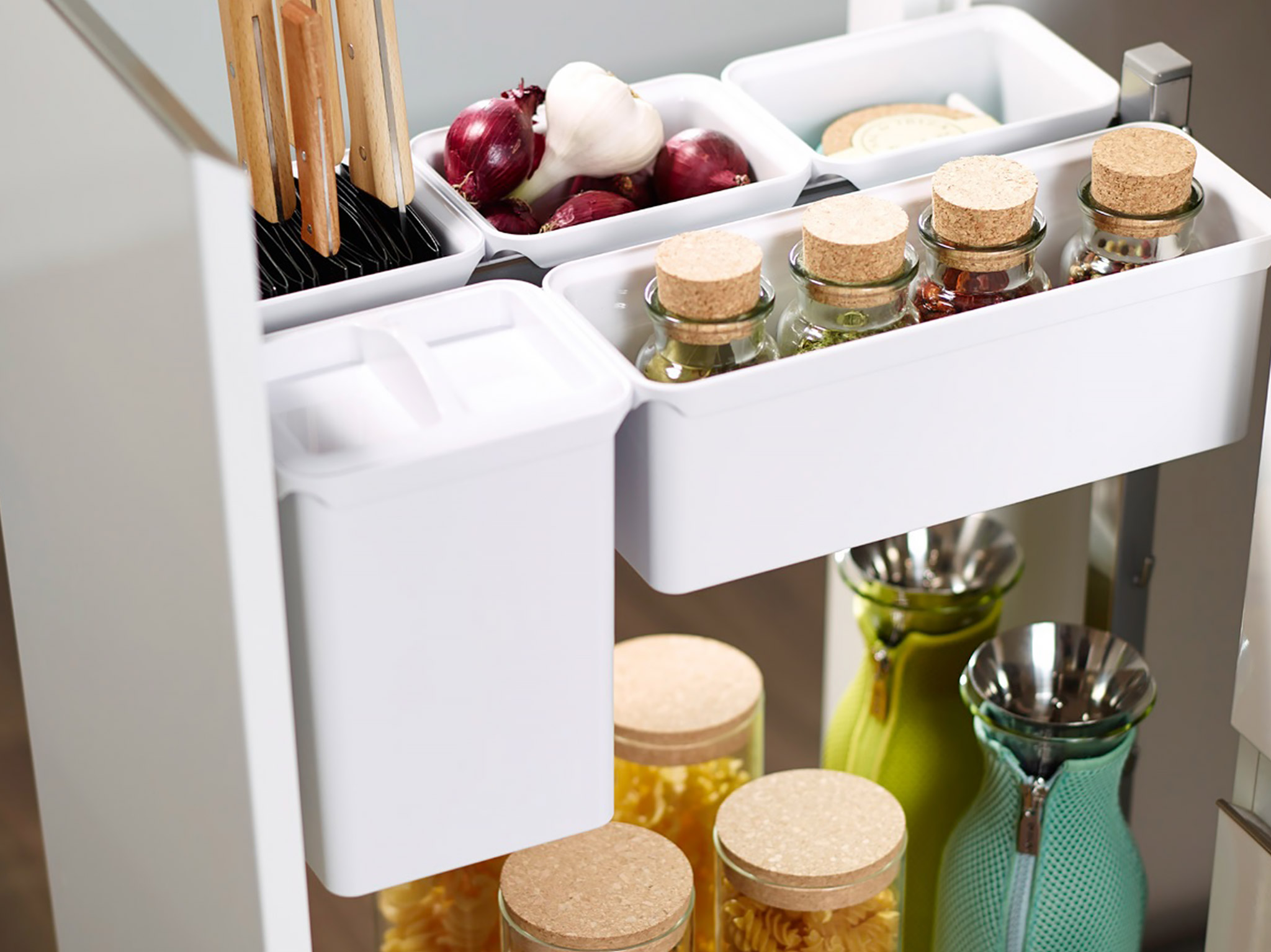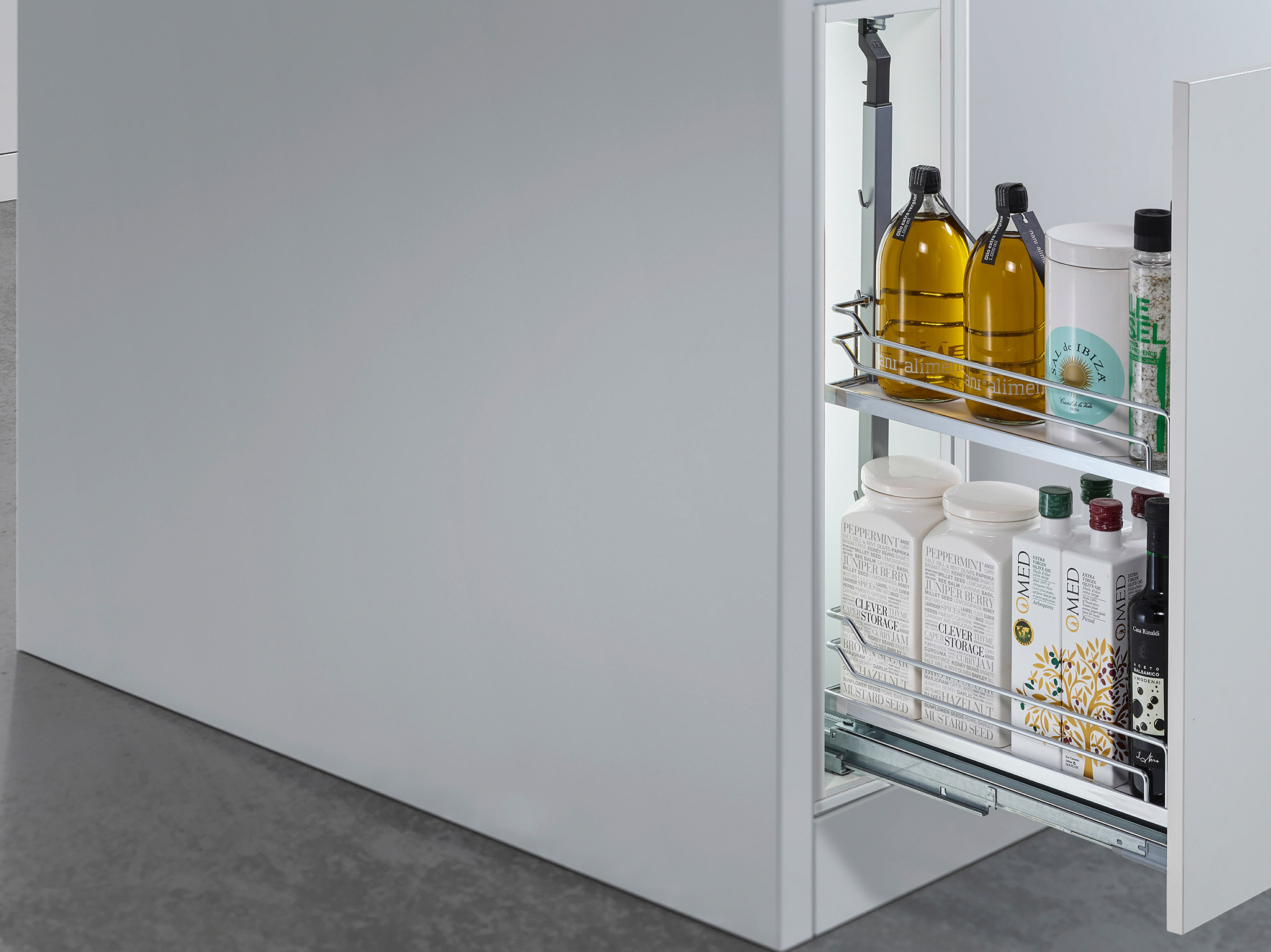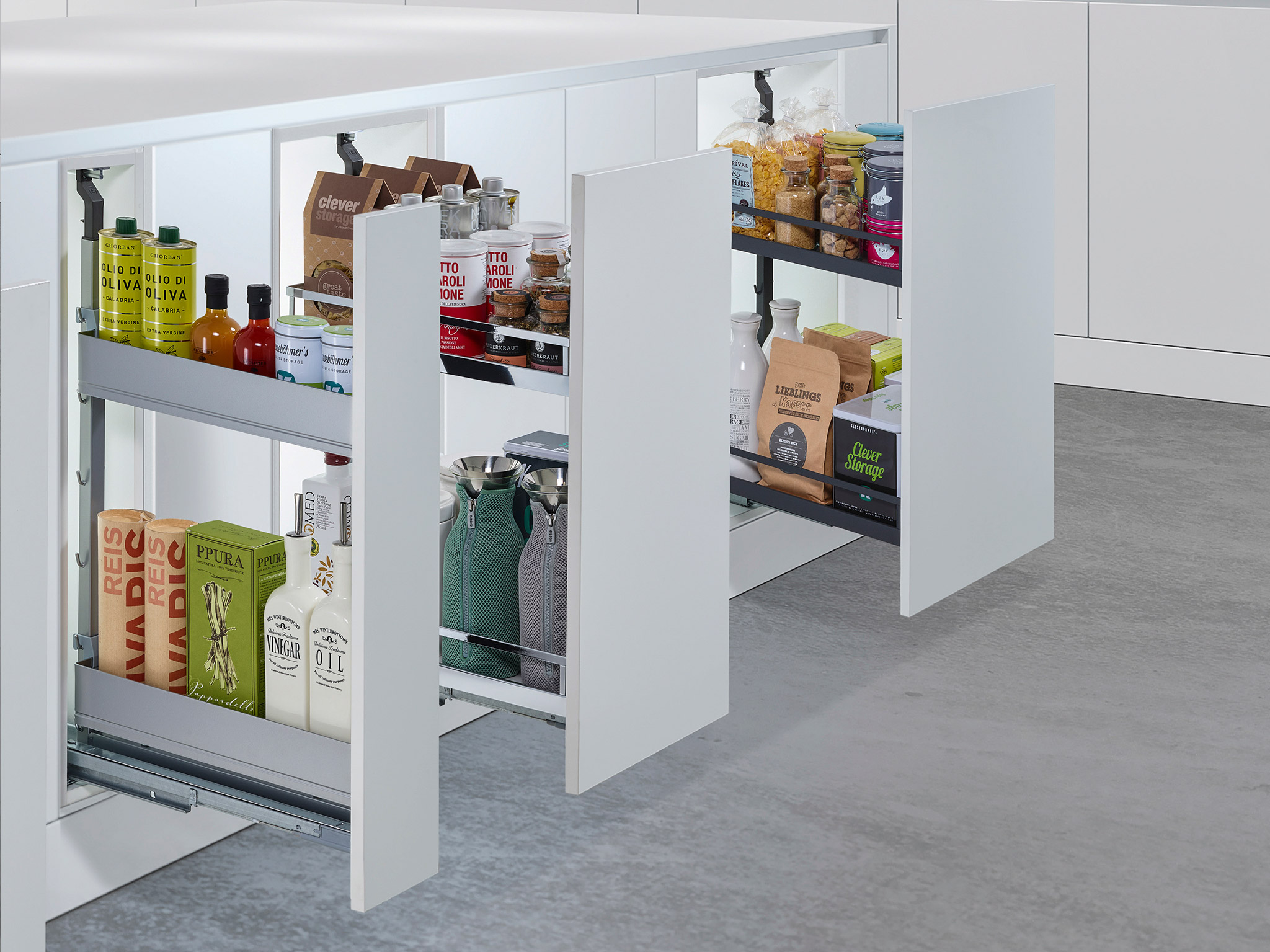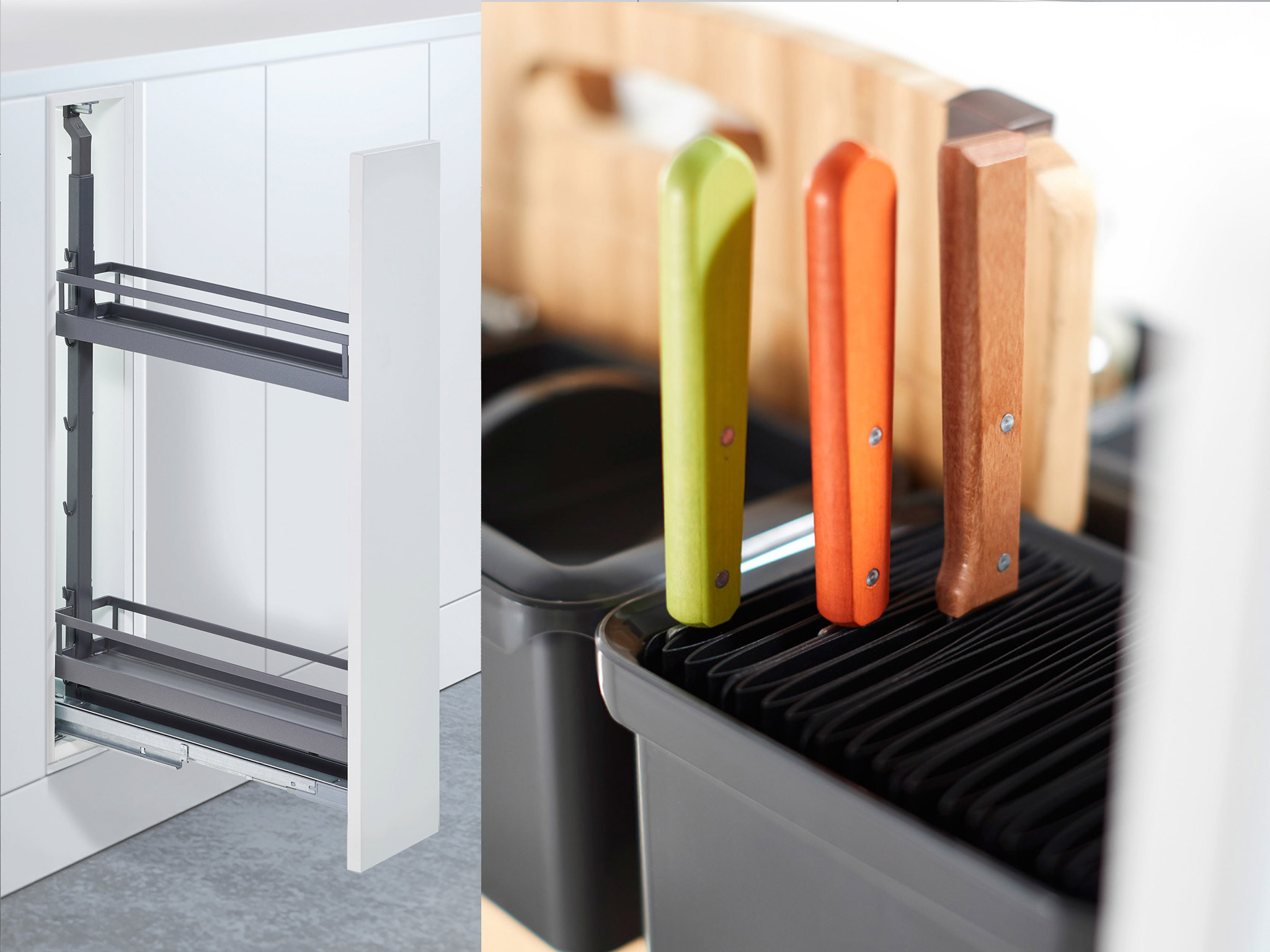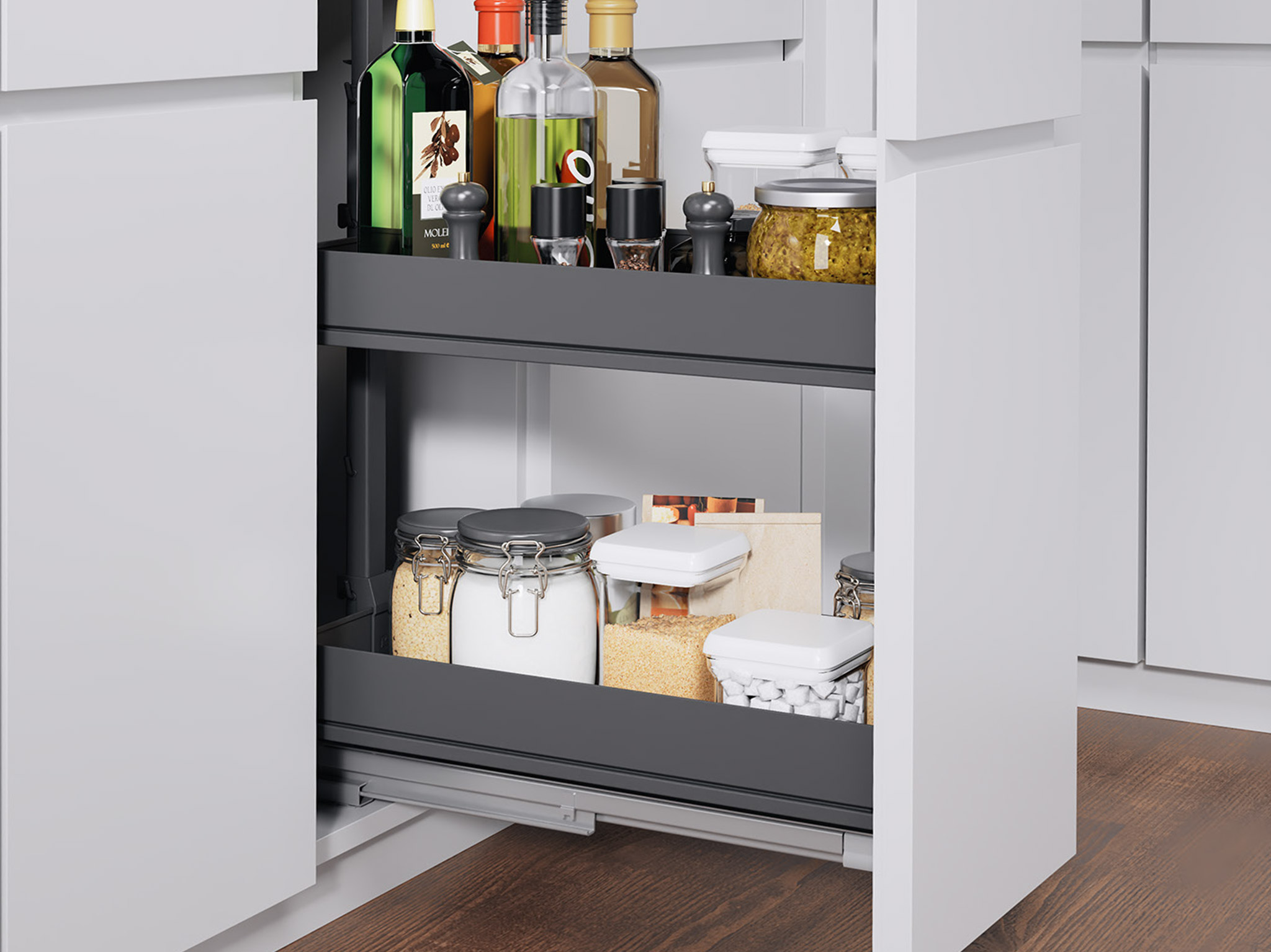 Маленький, сильный, умный – впечатляющая вариантивность модульного механизма подходит для организации хранения в нижних шкафах с шириной фасада 200, 300, 400 мм. Система крепится ко дну корпуса и предоставляет доступ с двух сторон. Плавное закрывание обеспечивается системой демпфирования. Нагрузка на механизм 28 кг.