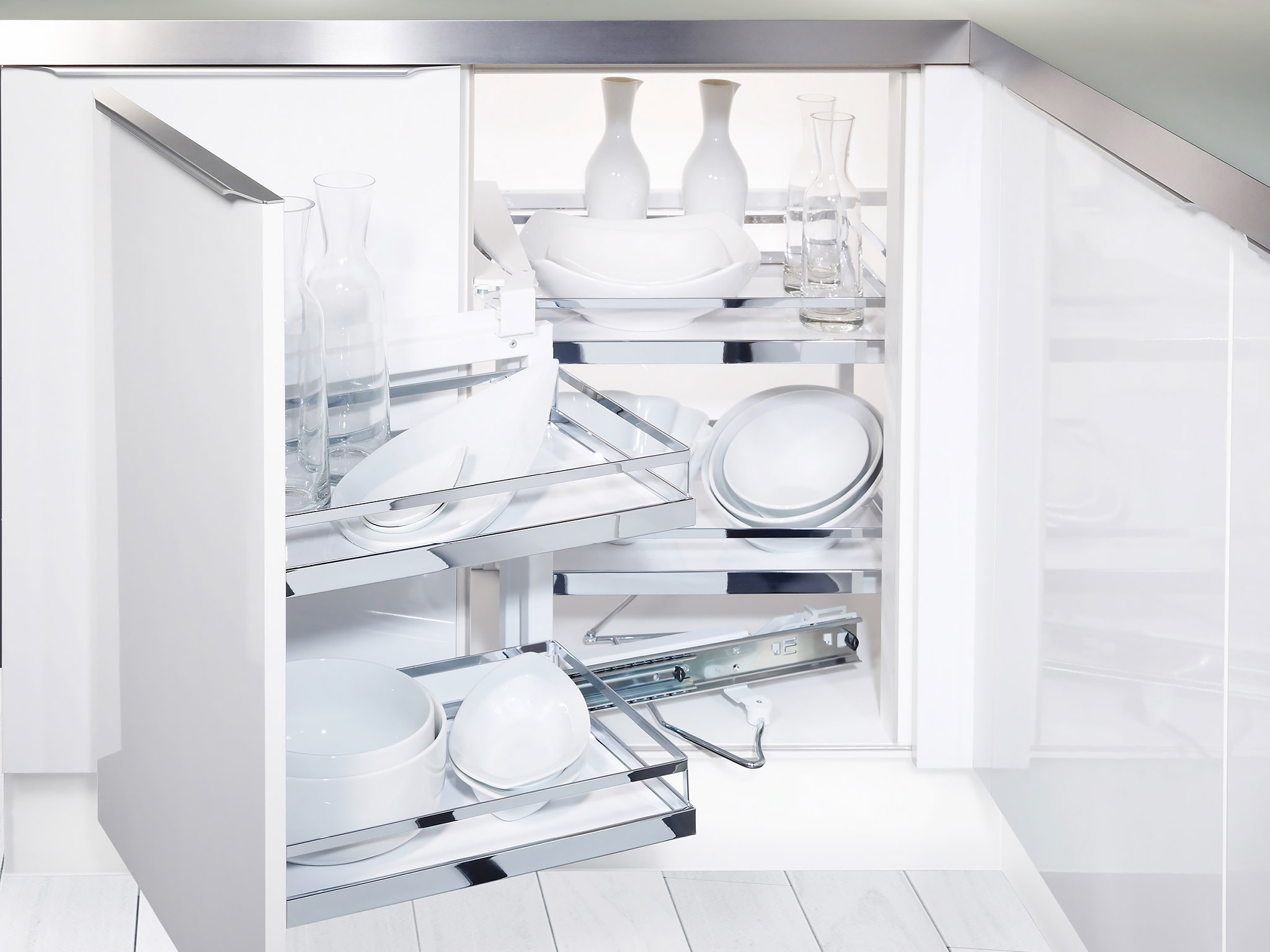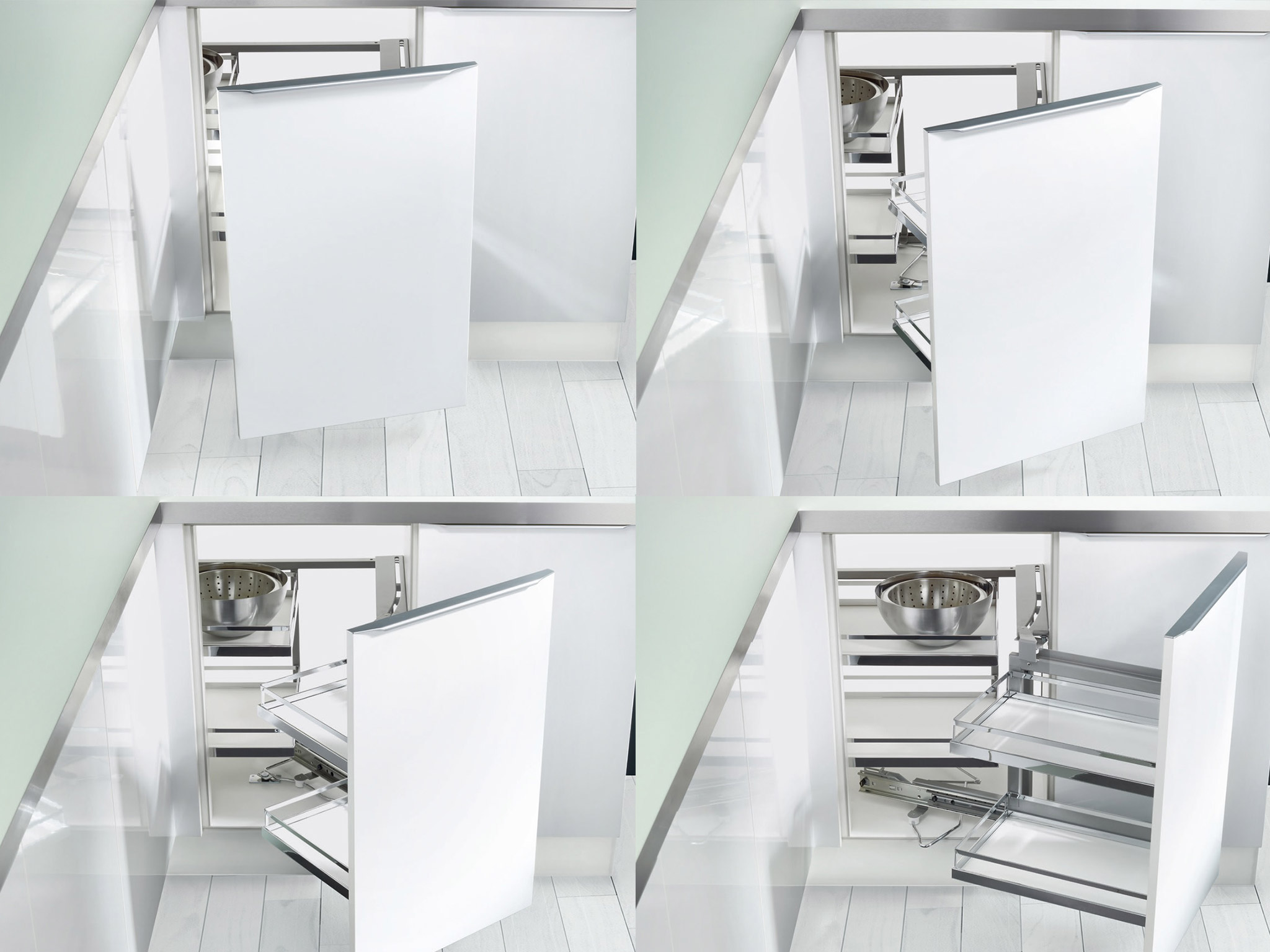 Магия движения в классическом решении для грамотного использования пространства в угловых тумбах — самом большом и труднодоступном месте на кухне. Полки выдвигаются одним движением руки одновременно с открытием шкафа. Закрывается механизм бесшумно и мягко благодаря демпферной системе Softstop и Softstopplus.
