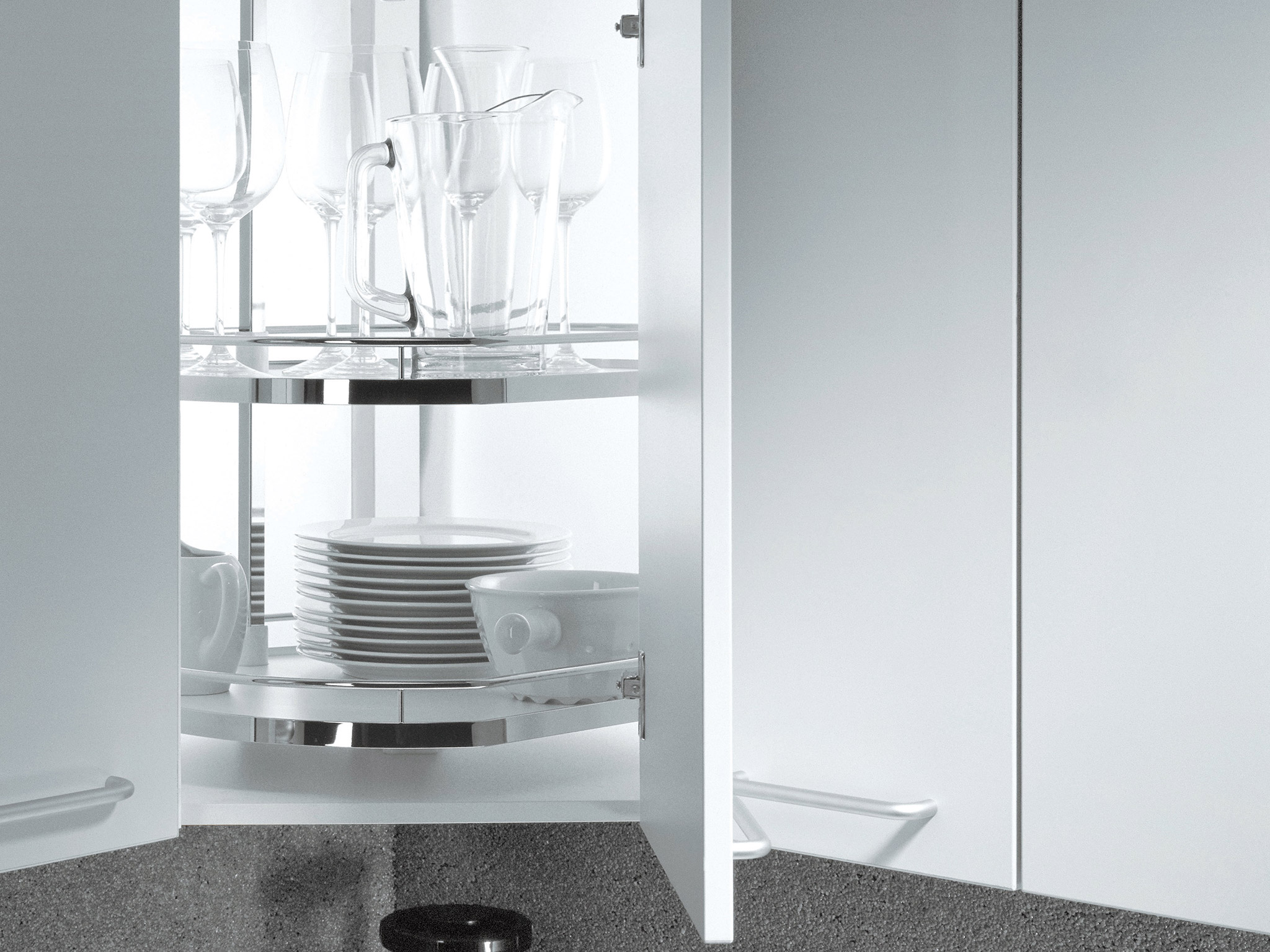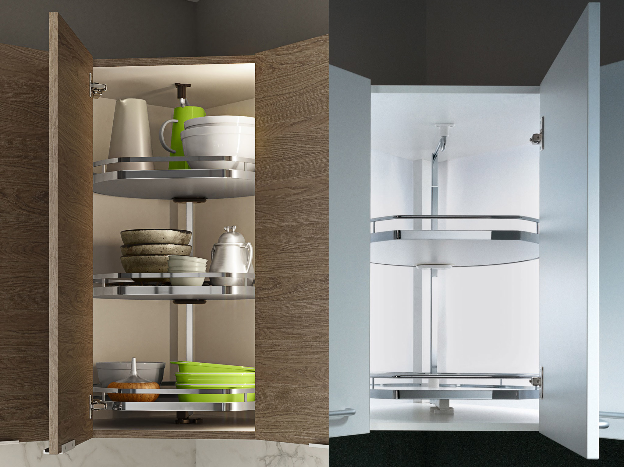Сделай полный круг используя угловое пространство в верхних шкафах рационально! Бесшаговая регулировка полок по высоте позволяет хранить высокие предметы, а телескопическая боковая стойка помогает использовать на максимум всю доступную площадь. Так как система вращается, вы легко сможете найти нужную вам вещь.